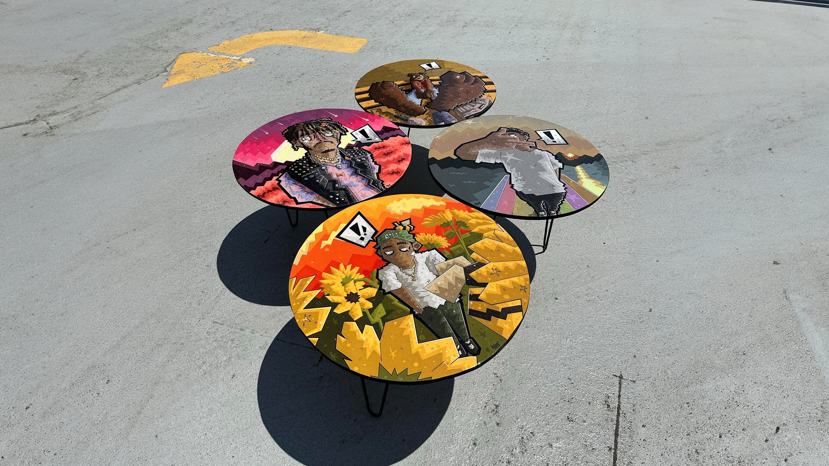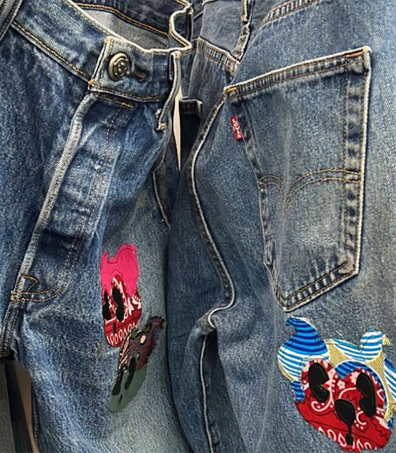 Custom jeans with The Peaceful People, featuring exclusive patch designs. Released at a New York pop-up, the collection sold out.